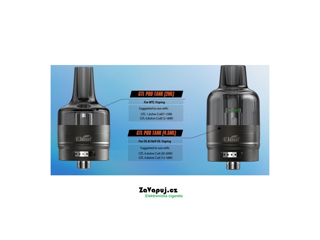 Není určeno pro náplně obsahující nikotin! Clearomizer GTL Pod s klasickým 510 závitem je praktický clearomizer od společnosti Eleaf. Plastové tělo PCTG se základnou z nerez oceli pojme až 4,5ml liquidu a je vhodný pro DL vaping. V základním balení budete mít na výběr dvě žhavicí hlavy, a to GTL o odporu 0,4ohm a 0,8ohm. Regulace přívodu vzduchu pro nastavení optimální kouřivosti se nachází ve spodní části.