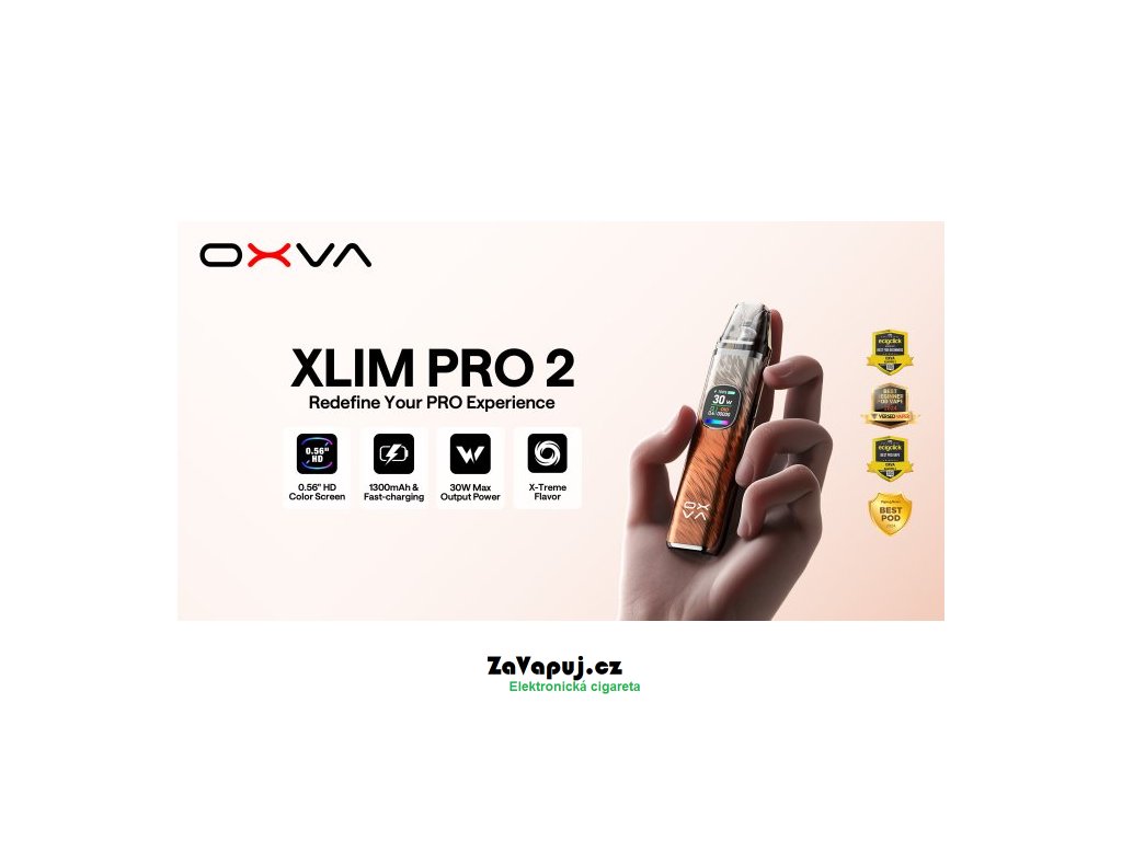 Elektronická cigareta OXVA Xlim Pro byla vyhlášena nejoblíbenějším POD zařízením mezi vapery za období 2023 a 2024. Nyní přichází výrobce s druhou řadou, která si pro Vás přichystala mnoho novinek. Elegantní a čistý designe těla baterie zdobí 0,56 palcový barevný Ultra-HD displej, který poskytuje vynikající přehled o nastavení všech hodnot. Vestavěný monočlánek nabízí vyšší kapacitu baterie 1300mAh, USB-C port s 2A nabíjením a výkonem až 30W. Na boční straně baterie je umístěno regulační tlačítko pro přívod vzduchu, díky kterému si jednoduše nastavíte RDL nebo MTL režim vapování. V obsahu balení najdete cartridge Xlim V3 s horním plněním - není potřeba vyndavat cartridge z těla baterie při plnění liquidem. Cartridge V3 jsou plně kompatibilní s verzí V2.