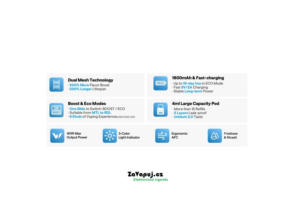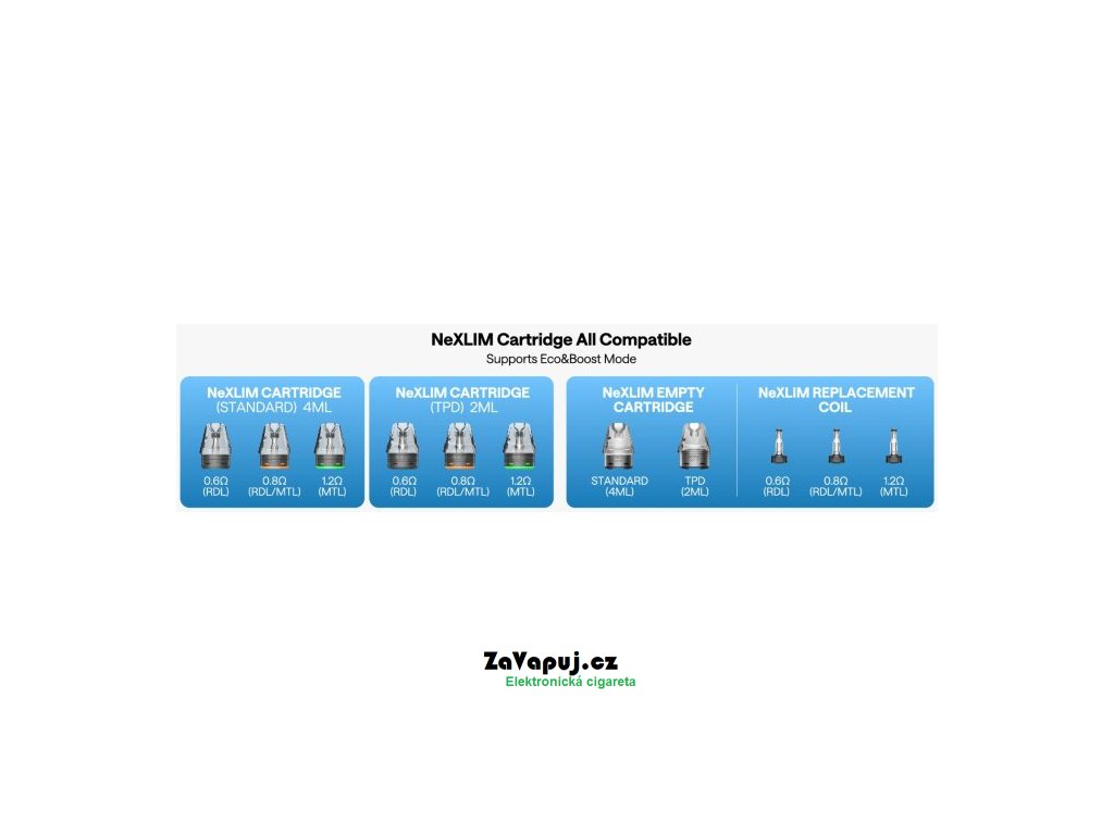 Není určeno pro náplně obsahující nikotin! OXVA NeXLiM GO představuje moderní POD systém s důrazem na výkon, výdrž a chuť. Díky technologii Dual Mesh poskytuje až o 200 % lepší chuť a životnost ve srovnání s běžnými cartridgemi. Výkonná baterie 1800mAh zajišťuje až 10 dní provozu v ECO režimu, s rychlým 5V/2A USB-C nabíjením. Přepínání mezi režimy BOOST a ECO přináší 6 různých vaping zážitků (0.6Ω / 0.8Ω / 1.2Ω), pro styl MTL i RDL. Zařízení je kompatibilní se všemi NeXLiM cartridgemi i žhavicími hlavami a podporuje jak klasický nikotin, tak i nikotinové soli.