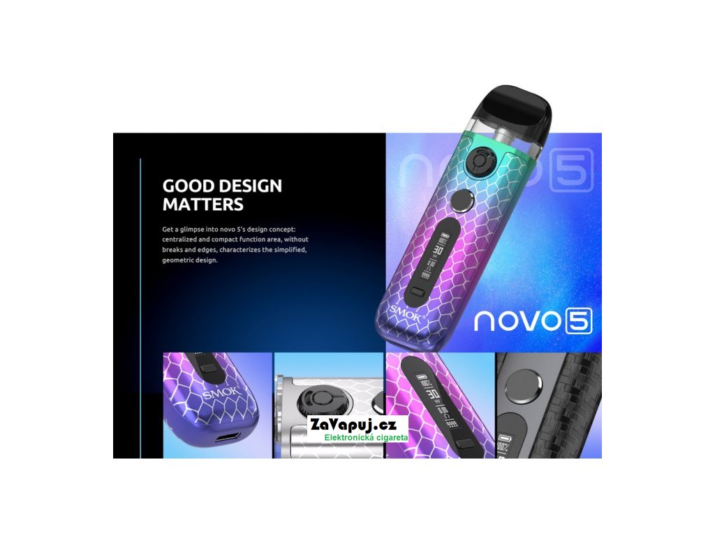 Krásný na povrchu, silný zevnitř - stručná, ale výstižná charakteristika elektronické cigarety Smoktech Novo 5. Kompaktní tělo baterie přináší vestavěný monočlánek o kapacitě 900mAh, nastavitelný výkon až 30W, inovativní regulaci přívodu vzduchu a rychlé nabíjení pomocí USB-C portu. Na přední straně je umístěn OLED displej, který umožňuje jednoduché nastavení hodnot a zobrazuje všechny potřebné informace. Tvorbu páry zajišťuje nejen spínací tlačítko, ale i systém automatického žhavení - stačí pouze potáhnout z náustku. Vyměnitelná cartridge (POD) se žhavící hlavou o odporu 0,7ohm pojme až 2ml liquidu.