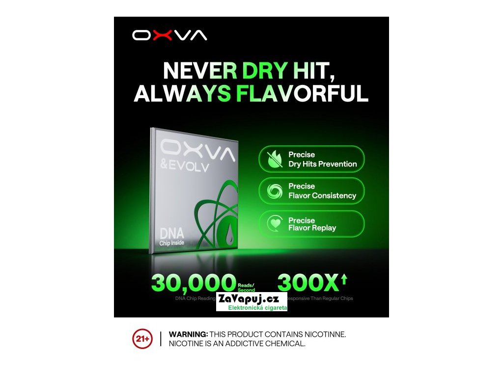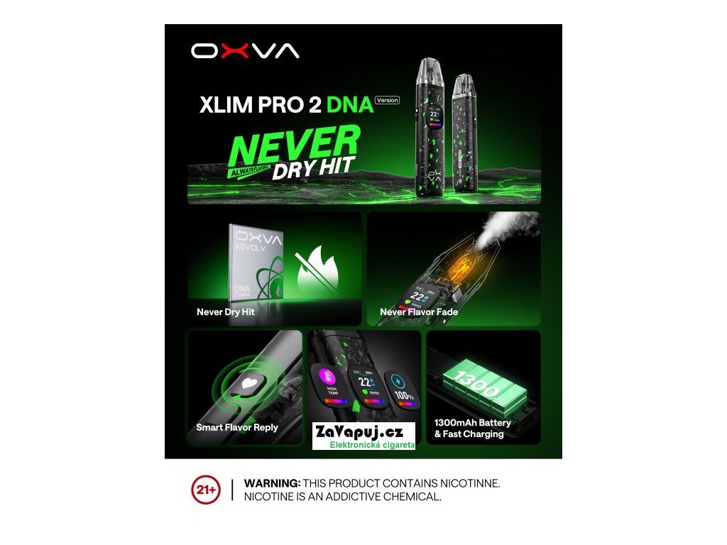 Prémiový pod systém OXVA XLIM PRO 2 DNA je postavený na pokročilém čipu EVOLV DNA, který je v komunitě pokročilých vaperů považován za technologický standard v oblasti přesnosti, bezpečnosti a uživatelské kontroly. Tento čip je vybaven technologií Replay, která umožňuje „zapamatovat si“ ideální potah a následně ho přesně opakovat – čímž zajišťuje konzistentní chuť při každém použití. Zároveň obsahuje systém ochrany proti dry hitu – čip analyzuje stav spirálky až 30 000 krát za sekundu a včas upraví výkon tak, aby nedošlo k připálení vaty ani při nízké hladině e-liquidu. Výsledkem je nejen lepší chuťový zážitek, ale i delší životnost cartridge. Tělo zařízení z luxusního kovaného karbonu a zinkové slitiny nejen skvěle vypadá, ale také vydrží každodenní používání. Baterie s kapacitou 1300mAh podporuje výstupní výkon až 30W a ve spojení s rychlým nabíjením přes USB‑C (5V/2A) je ideální pro celodenní provoz bez zbytečných prostojů. Vapování je maximálně přizpůsobitelné – zařízení nabízí automatické i tlačítkové spouštění, boční regulaci airflow a k tomu 0,56″ barevný displej, na kterém máš všechny údaje přehledně zobrazené. Pokročilejší uživatelé navíc ocení možnost plného přizpůsobení výkonových křivek a parametrů přes Evolv Escribe software na PC.