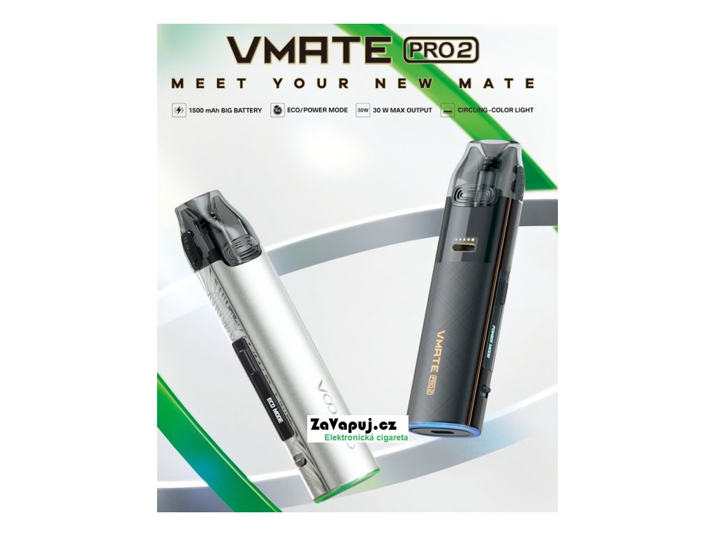 VOOPOO Vmate Pro 2 je chytrý pod systém nové generace v rámci oblíbené série Vmate, který spojuje elegantní design s výkonnými vylepšeními. Disponuje vestavěnou 1500mAh baterií, maximálním výkonem 30W a dvěma režimy potahu – ECO pro úsporný chod s inteligentní regulací výkonu a POWER pro ruční nastavení a intenzivní produkci páry. Zařízení je vybaveno 3ml cartridgí s horním plněním a ochranou proti protékání, 0.54" OLED displejem a plynulou regulací airflow, díky čemuž si jej užijí jak příznivci MTL, tak i RDL stylu vapování.