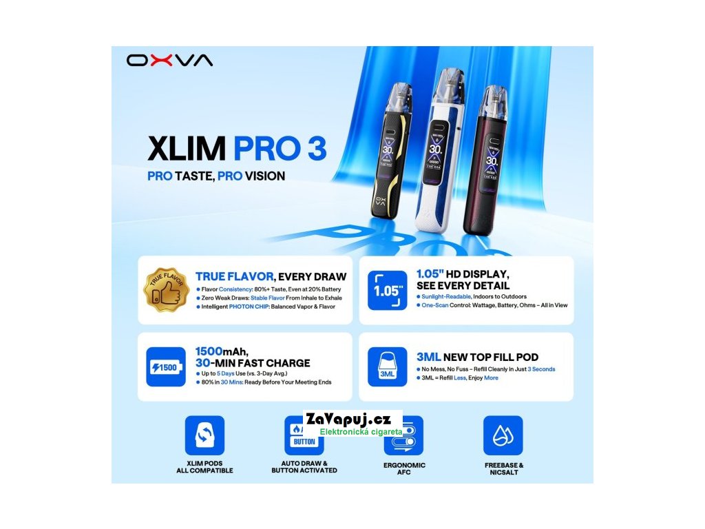 Není určeno pro náplně obsahující nikotin! Prémiový pod systém OXVA XLIM PRO 3 navazuje na úspěšnou řadu XLIM a přináší výrazně silnější výkon, delší výdrž a modernizované uživatelské rozhraní. S novou vysokokapacitní 1500mAh baterií, turbo nabíjením přes USB-C (5V/2A) a inteligentním PHOTON čipem patří XLIM PRO 3 mezi nejpokročilejší pod systémy své třídy. Zařízení podporuje výkon až 30W a díky široké kompatibilitě cartridge XLIM V3 & XLIM EZ nabízí maximální flexibilitu pro MTL i RDL uživatele. XLIM PRO 3 je vybaven inovovanými TOP-FILL pod cartridgemi, které jsou součástí balení ve variantách 0.6Ω a 0.8Ω. Podporovány jsou také odpory 0.4Ω a 1.2Ω, což umožňuje přizpůsobit styl potahu od razantního RDL až po jemnější MTL. Unitech 2.0 multi-layer technologie uvnitř XLIM podů zajišťuje čistou, výraznou a dlouhotrvající chuť. Velký 1.05" HD barevný displej přehledně zobrazuje výkon, odpor, stav baterie a další důležité informace. Ergonomické boční airflow umožňuje velmi přesné jemné doladění průtoku vzduchu podle osobních preferencí. Tělo zařízení je vyrobeno ze zinkové slitiny a PCTG, díky čemuž je odolné, příjemné do ruky a přitom si zachovává nízkou hmotnost pouhých 77g. OXVA XLIM PRO 3 je ideální volbou pro uživatele, kteří hledají kombinaci výkonu, rychlosti, komfortu a flexibilní kompatibility podů. Díky vysoké spolehlivosti a prémiovému zpracování je vhodný jak pro začátečníky, tak pro pokročilé vapery.