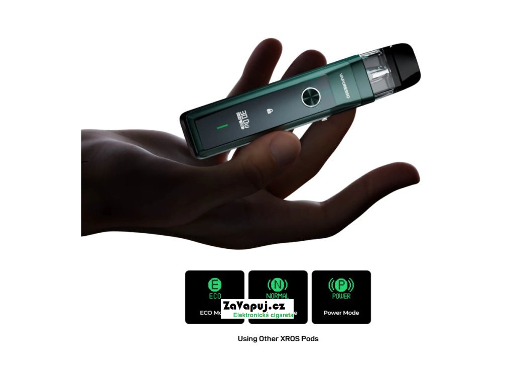 XROS PRO je nejpropracovanější a nejvýkonnější elektronická cigareta řady XROS od Vaporessa. Důmyslně zpracované tělo baterie disponuje monočlánkem o kapacitě 1200mAh, moderním displejem a především čipem AXON, který nabízí režimy Super Pulse (stálý výkon bez ohledu na stavu nabití baterie), ECO, Normal a Power s výkonem až 30W. XROS PRO je osazena cartridgí s vrchním plněním, objemem nádržky 2ml a Mesh spirálkou o odporu 0,4ohm. Tato cartridge je vybavena technologií COREX Heating Tech - příjemný vaping v kombinaci husté páry a vyladěné chuti liquidu. Cartridge je plně kompatibilní s předešlými modely